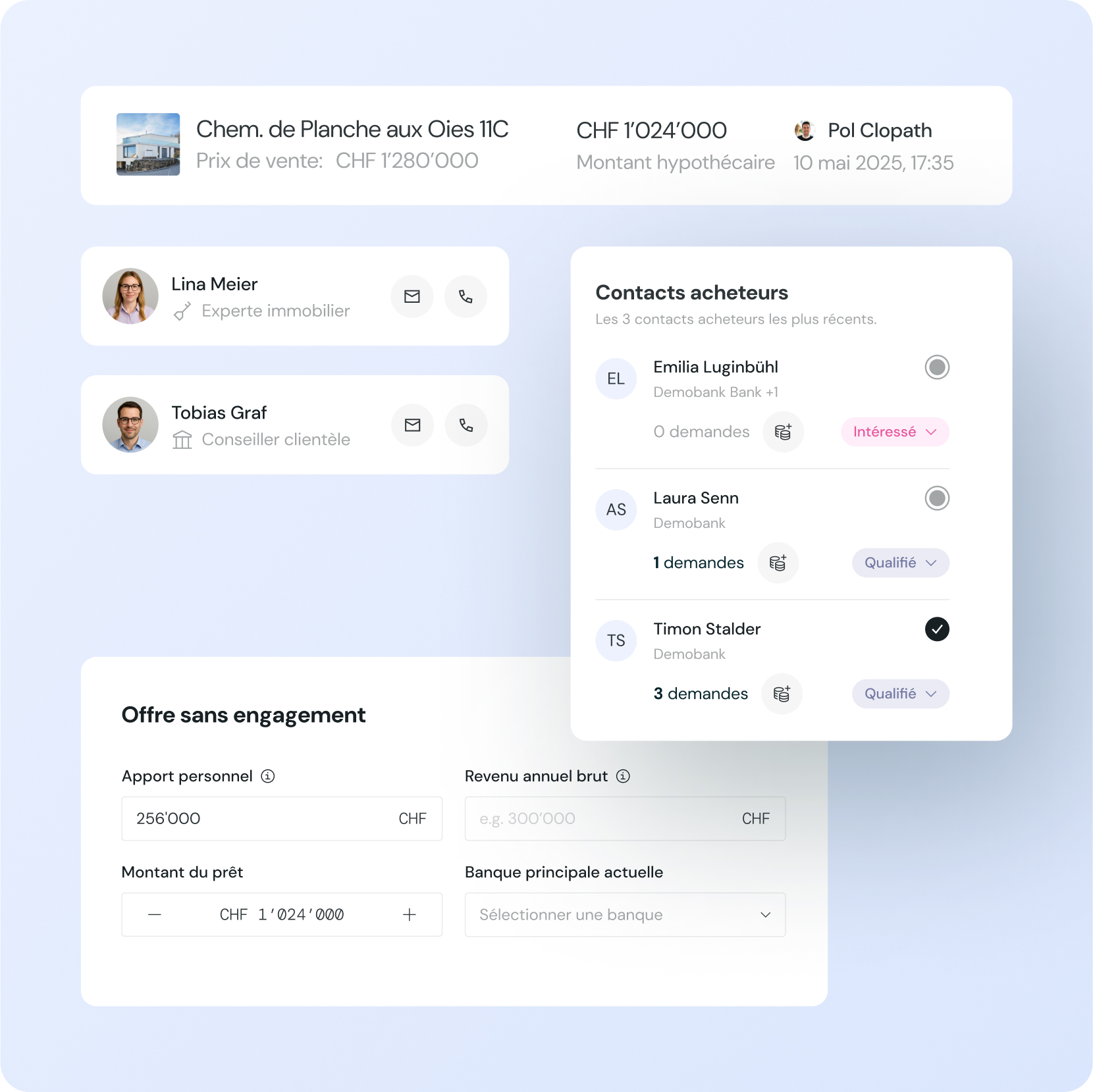 Participez à l’ensemble du processus, de l’onboarding du vendeur jusqu’au financement de l’acheteur. Accompagnez vos clients lors de chaque étape décisive, pas seulement lors de la demande de prêt hypothécaire.